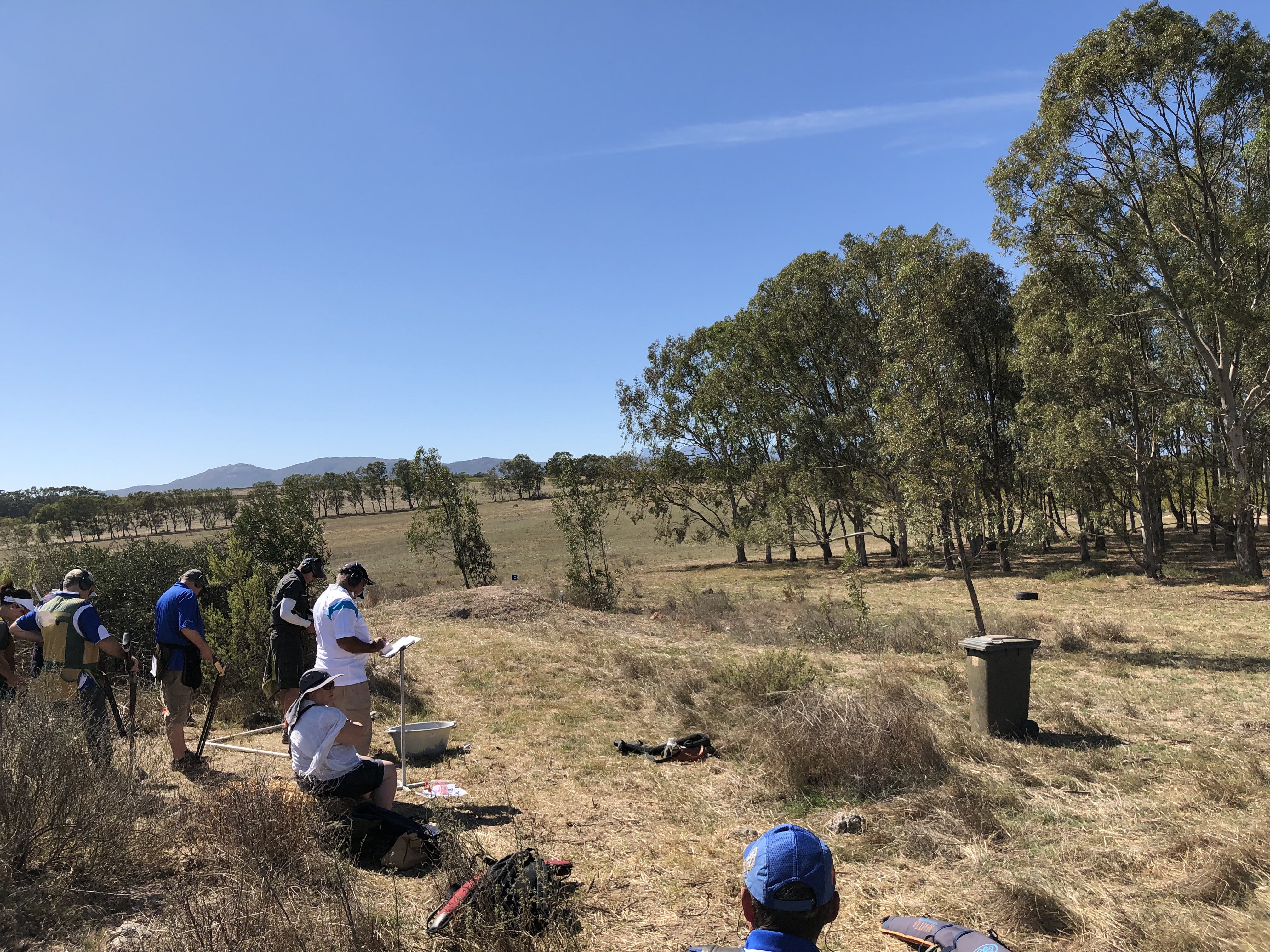 Zurück zu den Wettbewerben. Das Layout wurde von Clubmitgliedern gestaltet und von der FITASC offiziell abgenommen. Es war für jeden etwas dabei und auf einem sehr guten Niveau mit weiten, nahen und technisch anspruchsvollen Wurfscheiben. Das Gelände ist sehr unterschiedlich mit Ständen im offenen Gelände, am Wasser, auf einer Hügelkette oder auch an einem Hang. Jede Art von Wurfscheibe konnte geworfen werden. Der Valley Gun Club hat sich sehr viel Mühe gegeben und es wurden auch noch zusätzlich 100 Promatic Maschinen eingeflogen, um genügend Maschinen für die 3 Wettkämpfe zu haben. Die Verpflegung war sehr gut. Es gab jeden Mittag zwei Gerichte und einige Salate zur Auswahl, sowie jede Menge unterschiedliche Getränke. Des Weiteren stand an jeder Linie eine große Kühlbox mit kostenlosem Wasser für die Schützen bereit, sodass man bei Temperaturen von 28 bis 38 Grad nicht „verdursten“ musste. Mit dem ständig wehenden Wind waren die Temperaturen sehr erträglich und man konnte den Wettkampf in vollen Zügen genießen. Als Transportmittel zu den einzelnen Linien standen Pickups bereit, auf dessen Ladeflächen man, wie bei einer Safari, transportiert wurde. Alle Verantwortlichen waren sehr hilfsbereit und gastfreundlich.